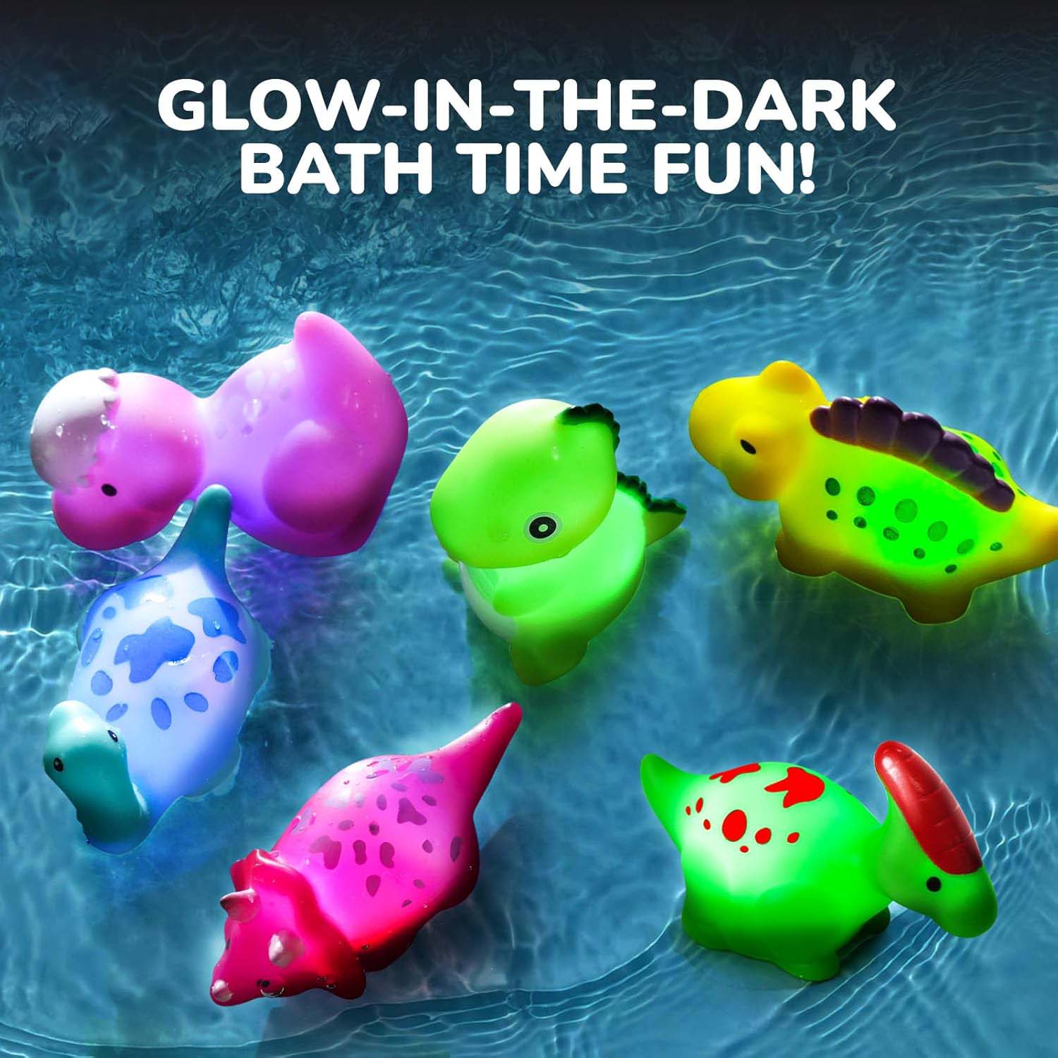 Watch their eyes light up! These adorable dinosaurs magically glow, transforming the tub into a wonderland.