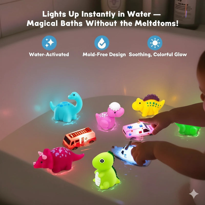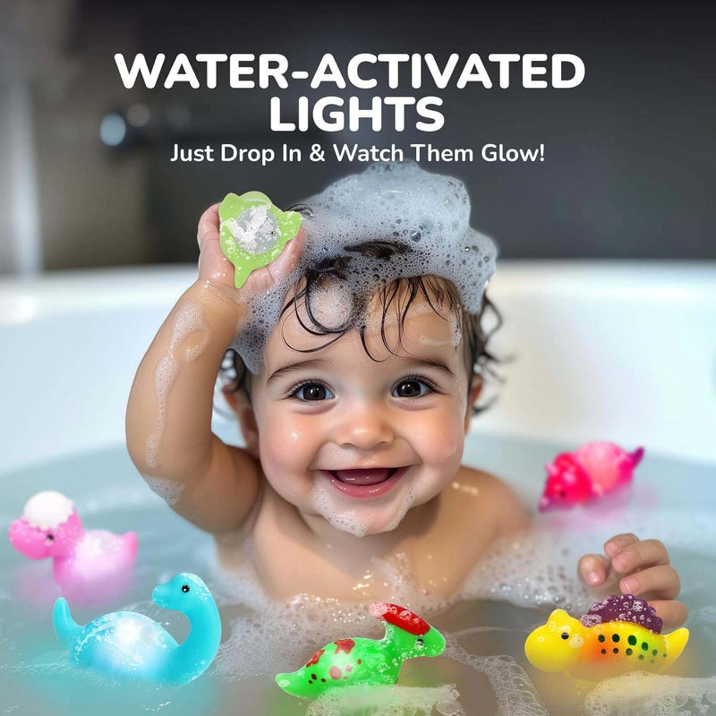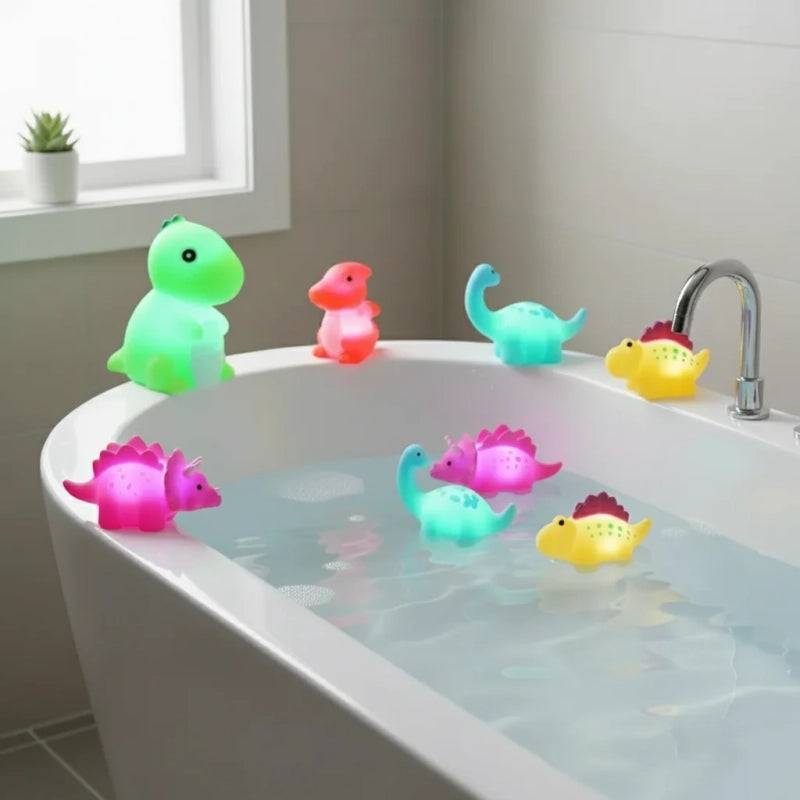 The magic? Our LED dinosaurs light up instantly in water, turning a dull tub into a glowing, prehistoric world.